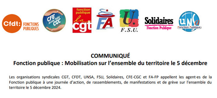 Les organisations syndicales CGT, CFDT, UNSA, FSU, Solidaires, CFE-CGC et FA-FP appellent les agent·e·s de la Fonction publique à une journée d’action, de rassemblements, de manifestations et de grève sur l’ensemble du territoire le 5 décembre 2024. Répandant des « fake